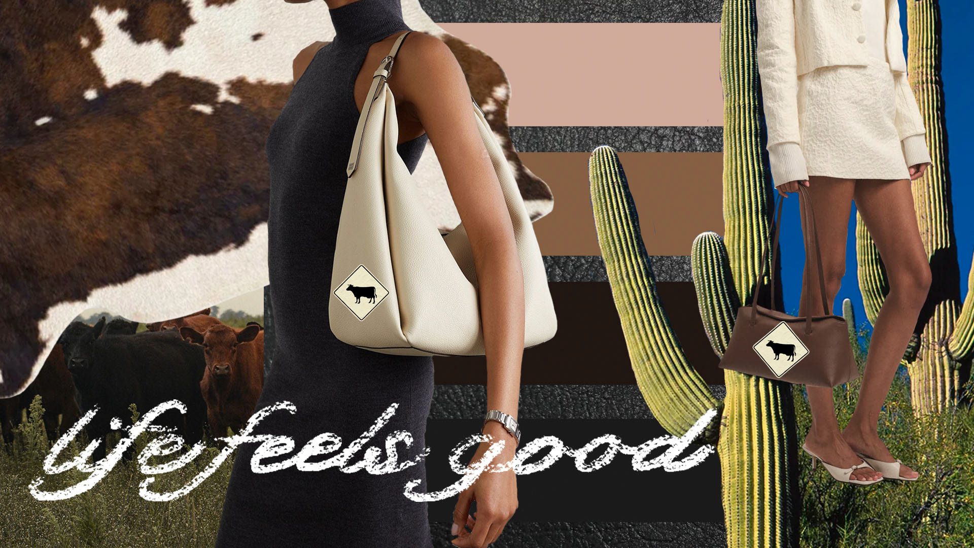 I wanted to keep a neutral color palette that displays aspects of cowhides and greenery. The green I picked speaks to modern veganism and the browns and creams project the colors and patterns of natural cow coats as well as authentic leather.